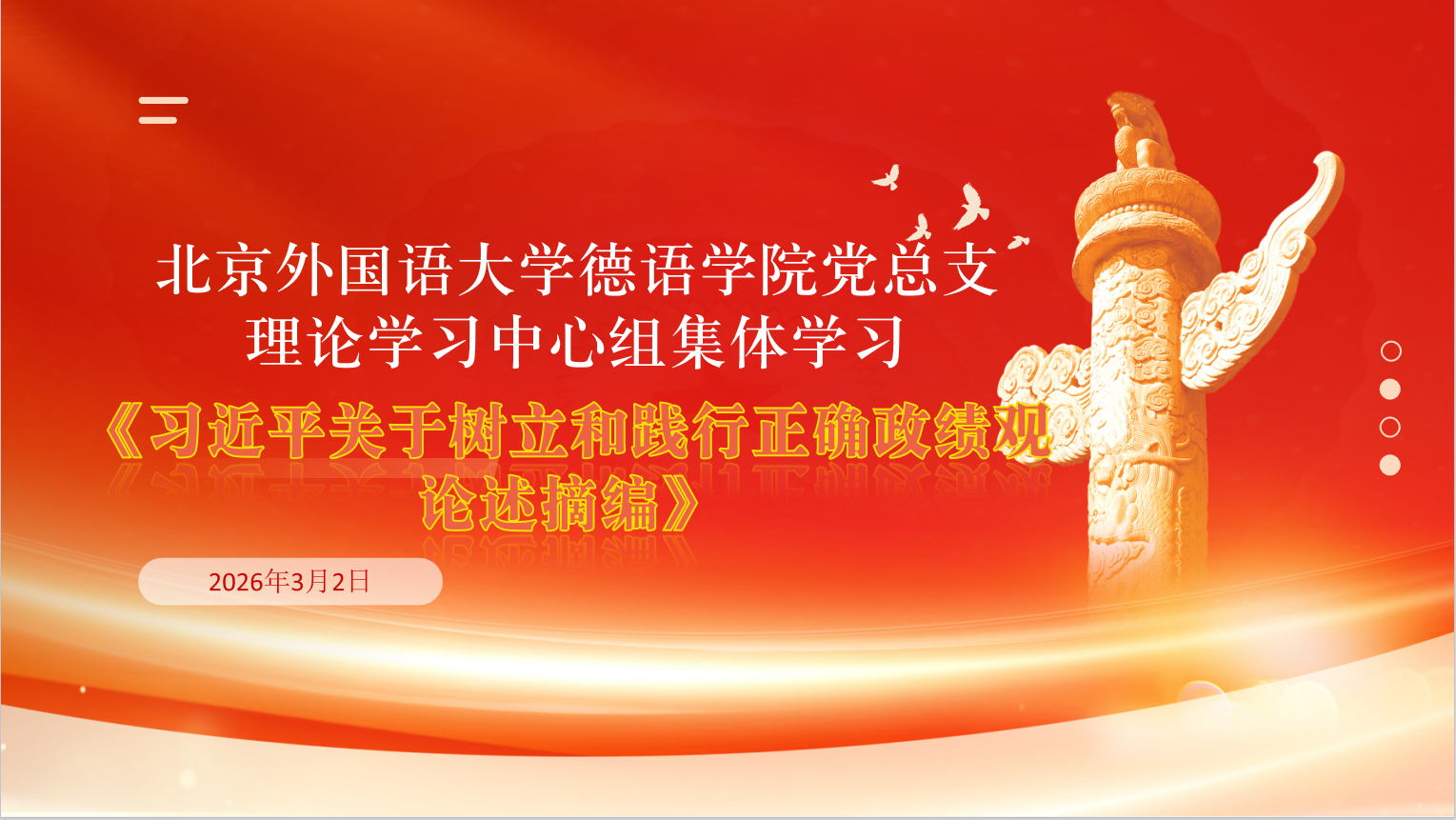 3月2日,德语学院党总支理论学习中心组召开专题学习会议。本次学习主题为“树立和践行正确政绩观”。党总支书记吴江,党总支副书记、院长张晓玲等全体中心组成员参加学习。