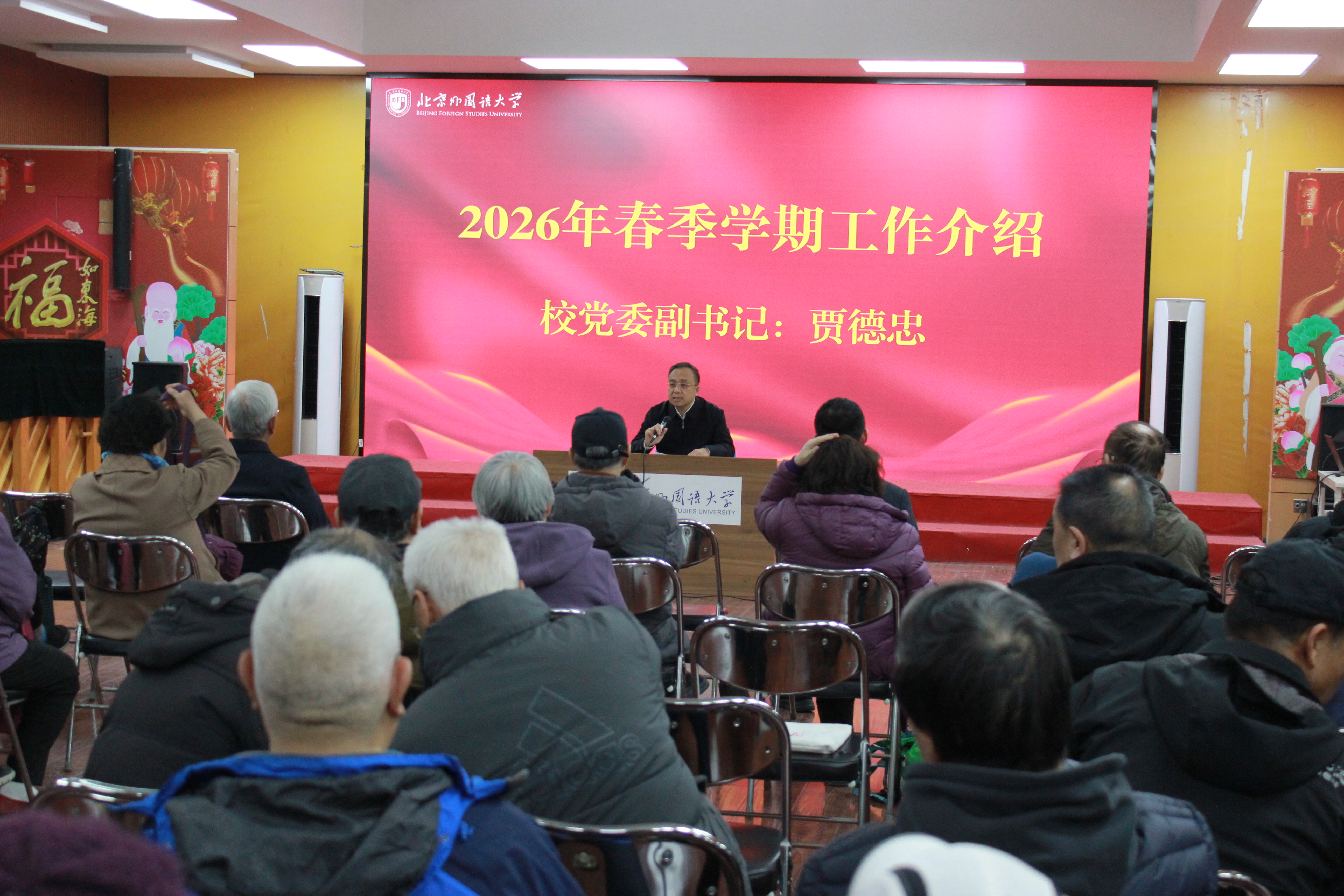 贾德忠表示,学校党委始终高度重视离退休工作,面对人口老龄化新形势,新的一年离退休工作要继续以离退休干部党建为引领,持续办好北外老年大学及“十件实事”,充分发挥学校关工委、老教协作用,扎实推进“银龄行动”和全国外语外贸院校离退休工作联盟等重点工作,不断提升离退休老同志的获得感和幸福感。